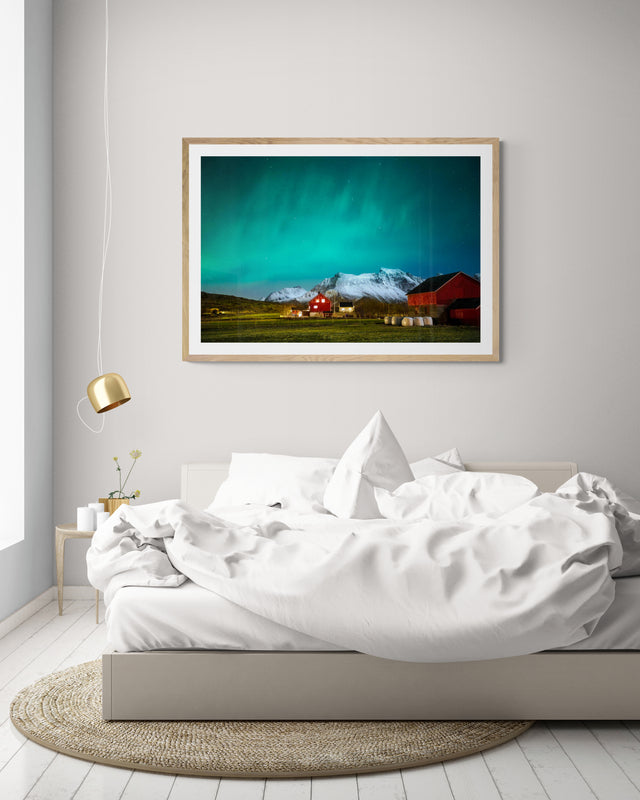 Elevate your space with this energy inspiring piece of the Aurora dancing on top of snow-capped mountains and farmlands nestled below.