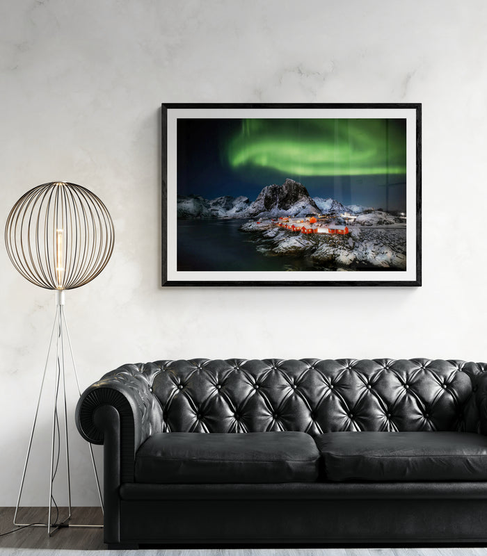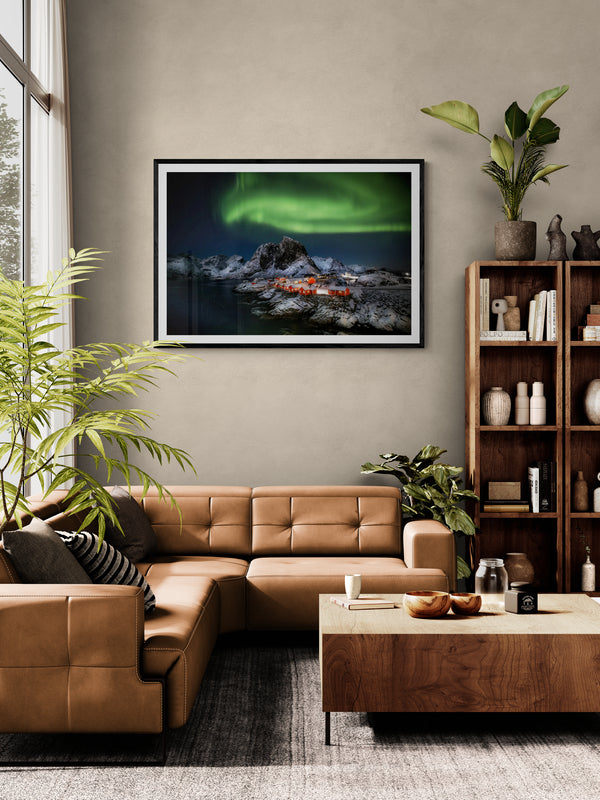 Elevate your space with this energy inspiring piece of the Aurora dancing on top of mountains as the little town below sleeps nestled against the rocky landscape and peaceful fiord.